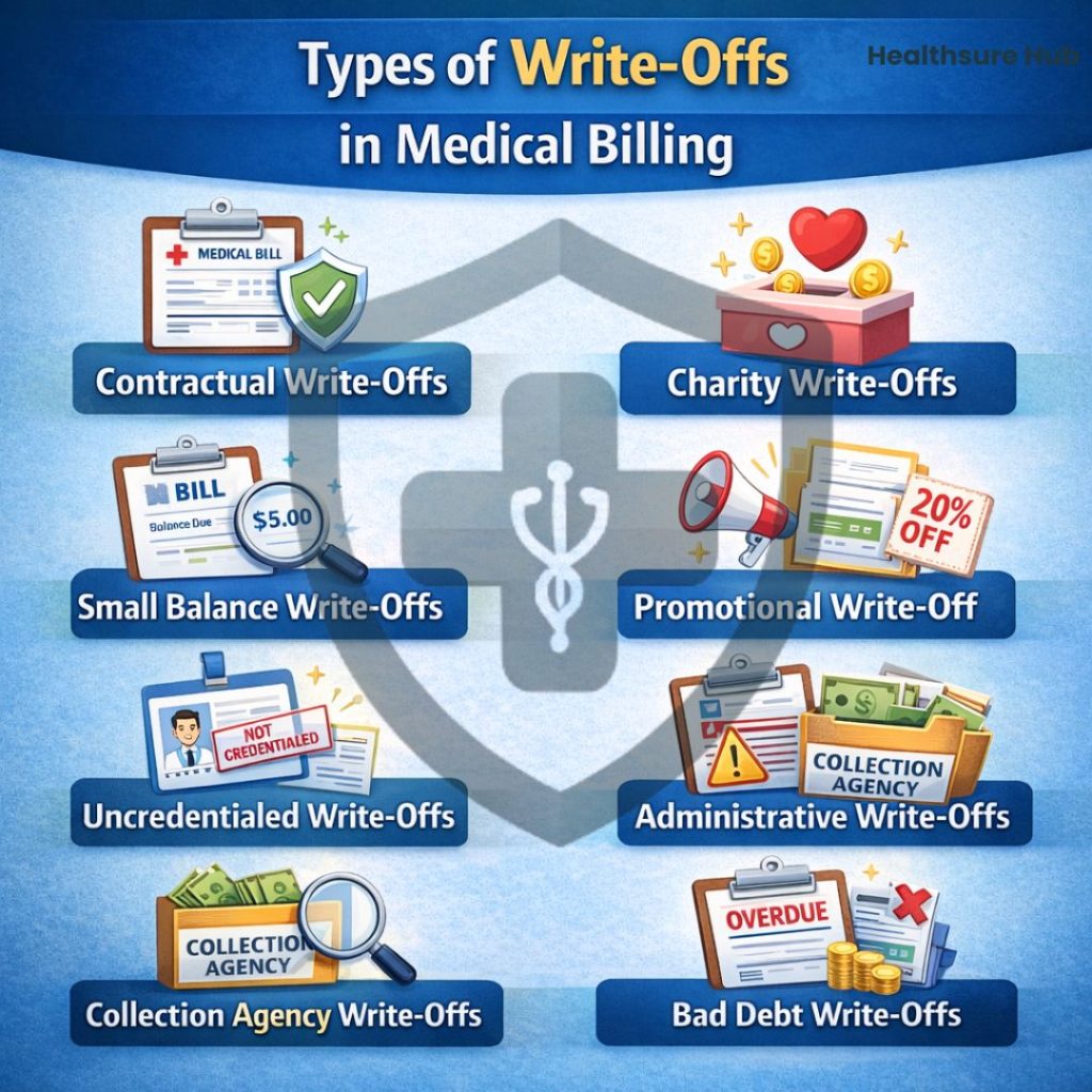 Contractual write off in medical billing is the most commonly used in medical billing. These occur when a healthcare provider accepts a lower, pre-negotiated rate from the insurance company for the services rendered.. For example, if a service is billed at $200 but the insurer allows only $150, the $50 difference is a contractual write-off.